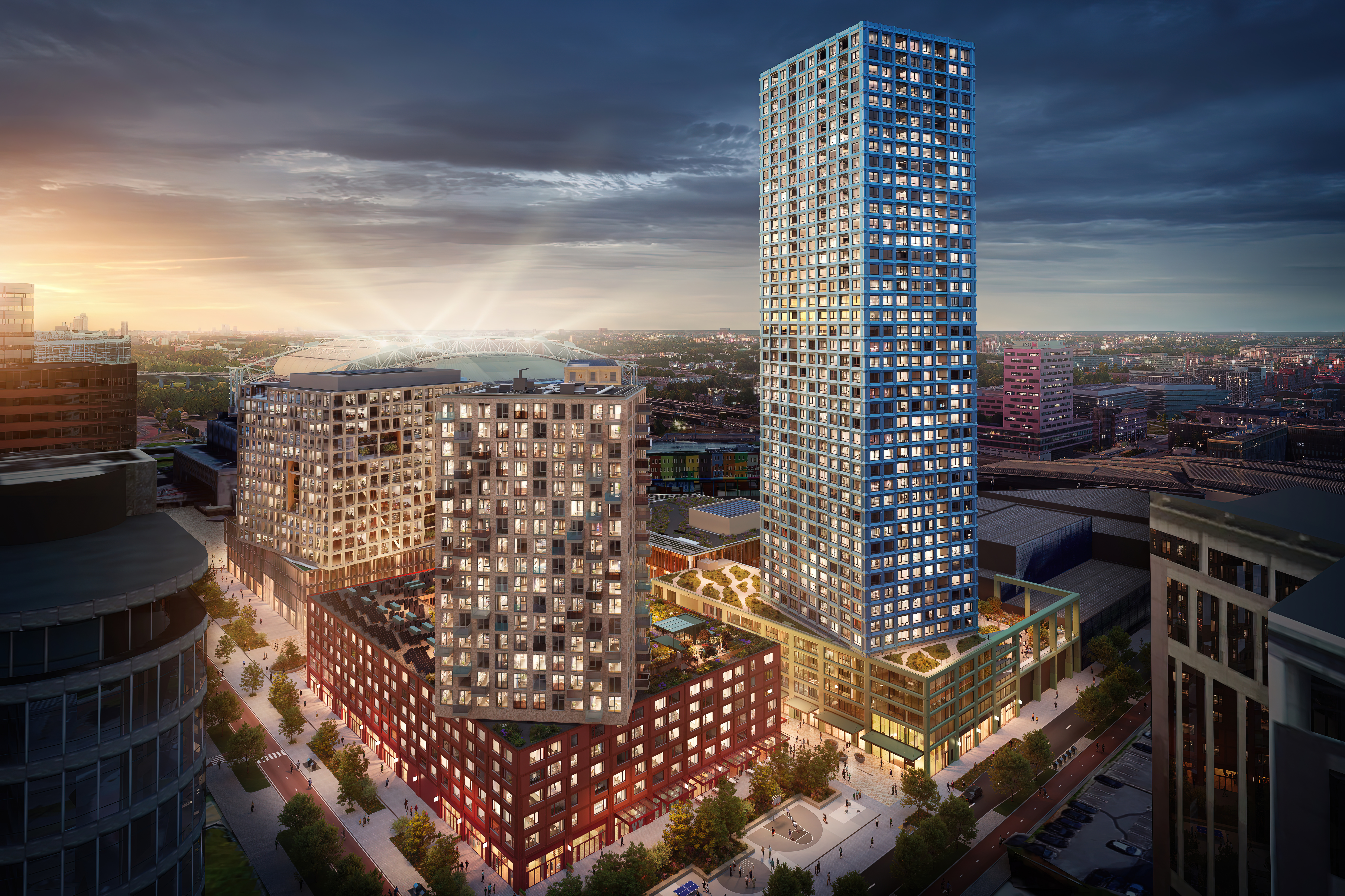 Eleven Square, situated between the Johan Cruijff ArenA and Bijlmer ArenA station, will consist of four buildings designed by the internationally renowned architects of MVRDV. One of them will become the tallest residential tower in Amsterdam: a new landmark in the city's skyline.
