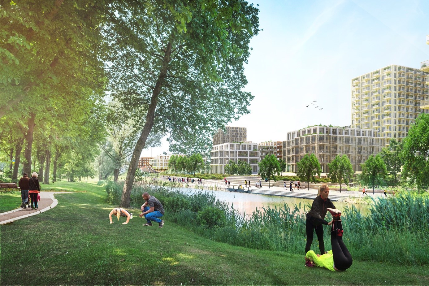De ontwikkeling kenmerkt zich door verschillende gebouwen in een doorlopend parklandschap, wat een levendige omgeving creëert met veel ruimte voor recreatie en ontmoeting.