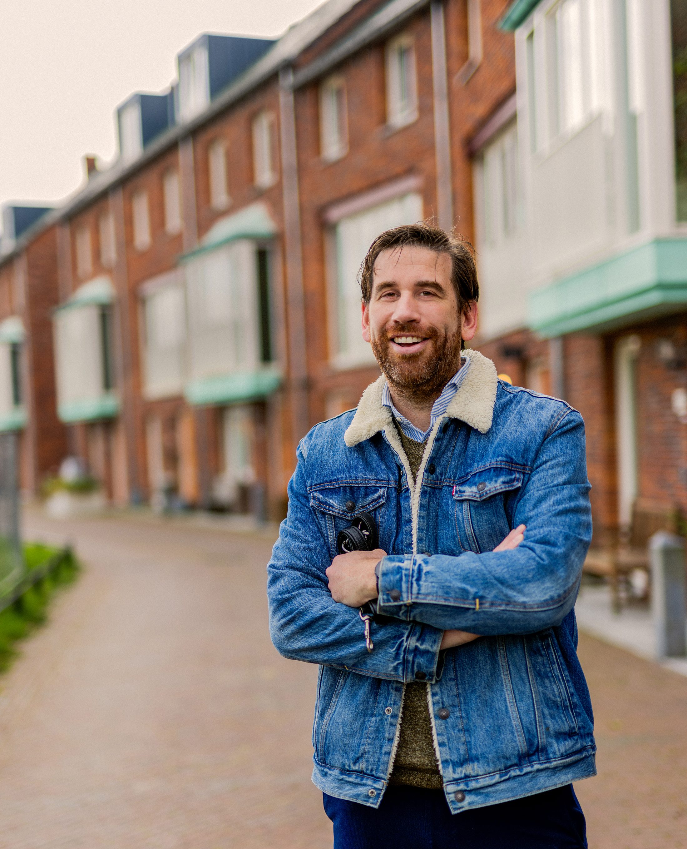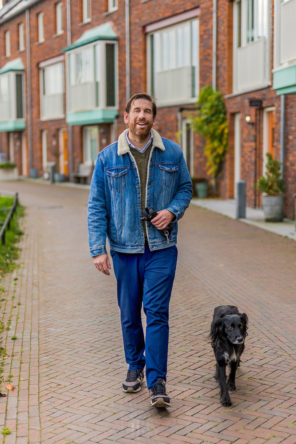 Rolf loopt een rondje met hond Bobo. Rolf: “We hebben hem in coronatijd gekocht. Met een hond doe je toch makkelijker contacten op in de buurt.” Zijn vrouw en hij wonen allebei al hun hele leven in Delft. Ze zijn blij met hun woning in Schoemaker Plantage. “We zochten een groter huis en het hele concept sprak ons aan: de stijl, de ruimte en het park voor de deur.” Ze hebben twee jonge kinderen van 1 en 3. “Die zijn blij met alle speeltuintjes in de buurt. En het afgelopen jaar zijn er hier wel tien kinderen geboren. Veel mensen zitten dus in dezelfde levensfase, dat is leuk.”
