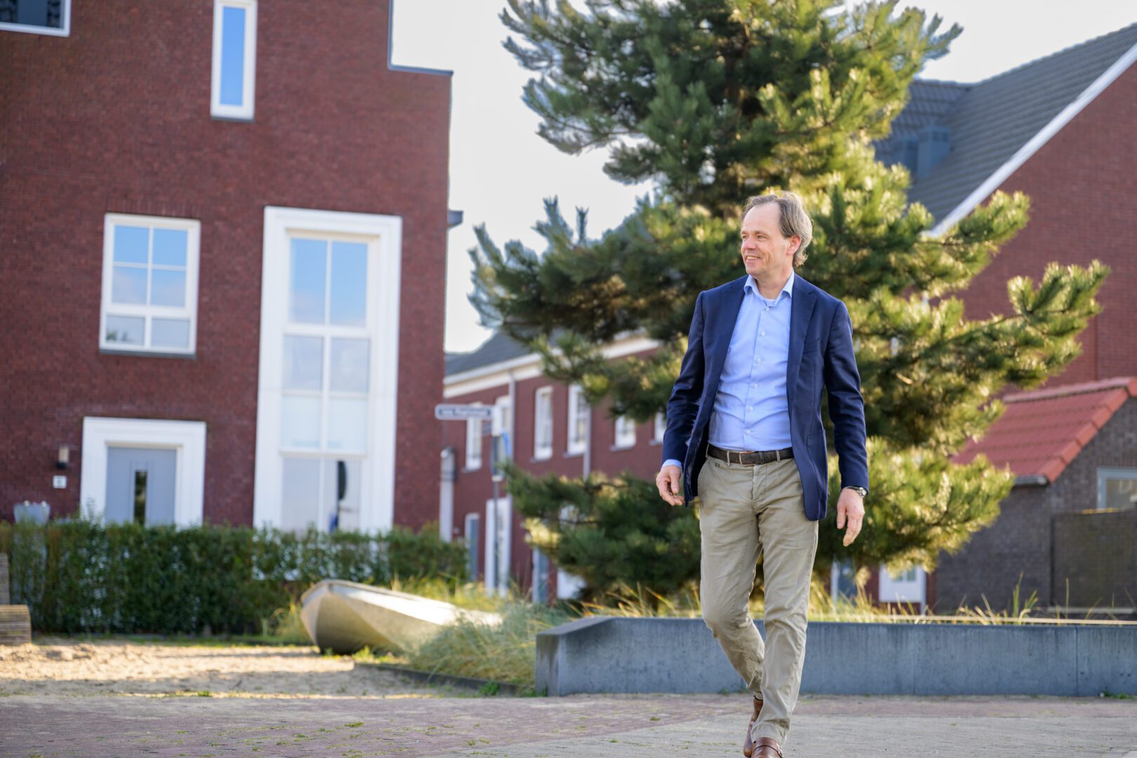 AM probeert de verbondenheid en betrokkenheid bij de buurt dus te stimuleren met slimme ontwerpen. “Zo zorgen we voor autoluwe gebieden zoals hofjes en binnenpleinen, met voorzieningen waar mensen elkaar makkelijker ontmoeten. Zoals banken in het groen of extra brede vensterbanken zodat je aan je huis met je buren een kop koffie kan drinken in de zon. We zorgen voor wandel- en fietspaden en sport- en speelvoorzieningen zodat mensen elkaar ontmoeten wanneer ze buiten zijn.” Stef zorgt er daarnaast voor dat er ook in een vroeg stadium al gewerkt wordt aan placemaking: het creëren van een buurtgevoel, nog voordat het gebied gebouwd is. Hij is een echte verbinder. Stef: “In elk project zie ik kansen om nieuwe bewoners, omwonenden, ondernemers en gemeente dichter bij elkaar en het gebied te brengen.” Zijn enthousiasme ontstond toen hij betrokken was bij Hoef en Haag, het nieuwe dorp nabij Utrecht dat AM ontwikkelde. Stef: “Ik wist dat we meerwaarde moesten bieden als we de Utrechters wilden overtuigen om naar het dorp te verhuizen. Ik moest mensen in beweging krijgen om daar te komen kijken. Dat deed ik onder andere door onze woonwinkel te koppelen aan een horecazaak waarvoor we een lokale ondernemer hebben benaderd. Zo konden mensen bij ons informatie krijgen over het project en meteen een kop koffiedrinken of lunchen. We hebben ook activiteiten georganiseerd vanuit die woonwinkel om mensen naar de locatie te halen, met elkaar in verbinding te brengen en het gebied een identiteit te geven. Denk aan een hardloopwedstrijd voor de jeugd en een ontbijt met de nieuwe supermarkt. We organiseren zulke eerste evenementen met de hoop dat de bewoners dit daarna overpakken en daarnaast is het een goede basis voor de marketing van het gebied.”